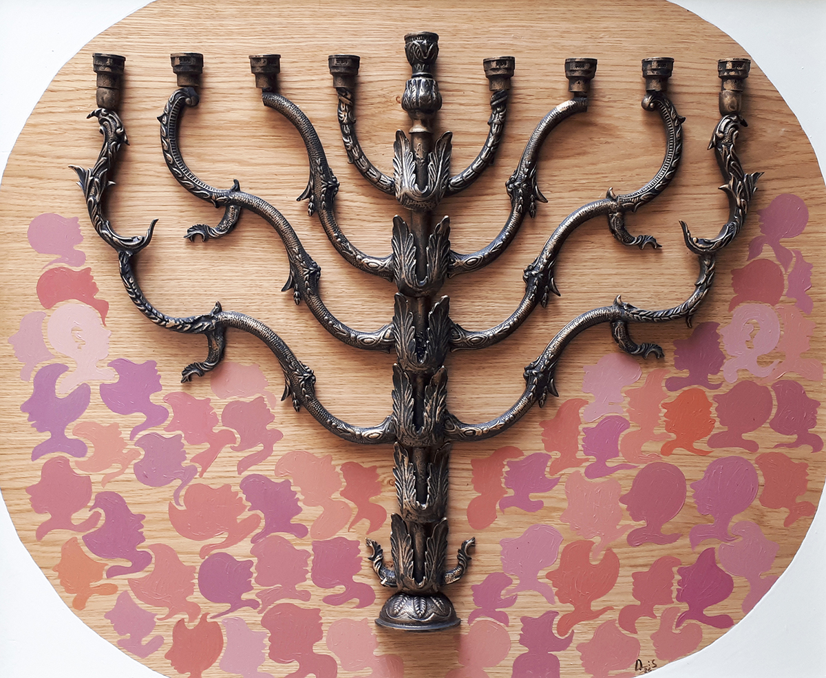Oil on wood and Hanoukkia made of parts of an antique chandelier, 61'5 cm x 52'5 cm, 2021.